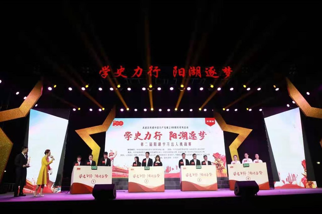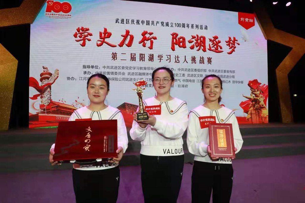 比赛间隙,“经典诵读进百村”优秀节目《党旗颂》带领现场观众走过百年沧桑,重历百年峥嵘,并将现场气氛推向高潮——冠亚军决战一触即发。9道高难度线索题,选手们一对一挑战。两支队伍旗鼓相当,各自险胜一轮。第三轮抢答异常胶着,双方比分交替上升,最终在加试赛中,中片党员战队力克对手,成为前黄站冠军。